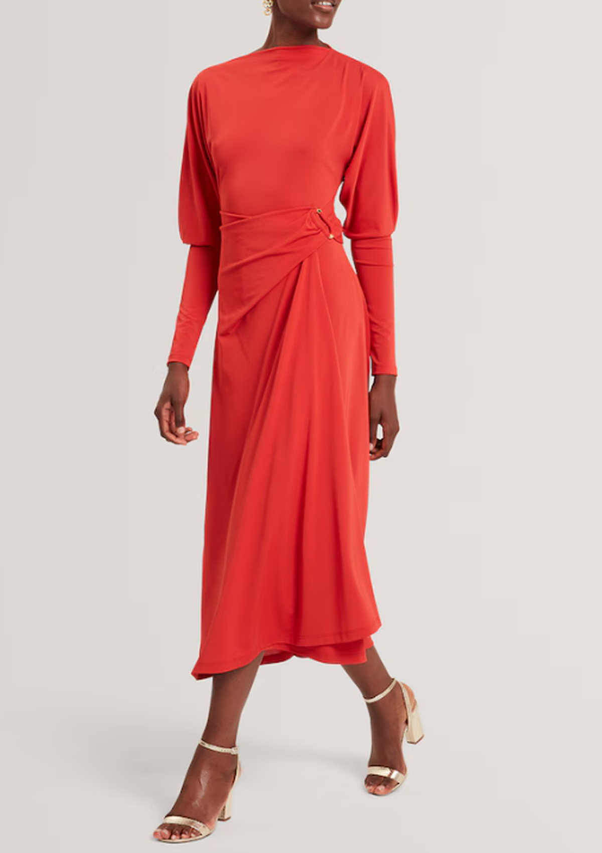 Ted Baker’s orange dress is a gift for someone who thrives under warm lighting. The silhouette is structured yet soft: a high neckline, subtle shoulder definition and a gathered waist that flatters without clinging. The midi length makes it party-ready but still appropriate for January events when the sparkle has worn off but the styling pressure has not.