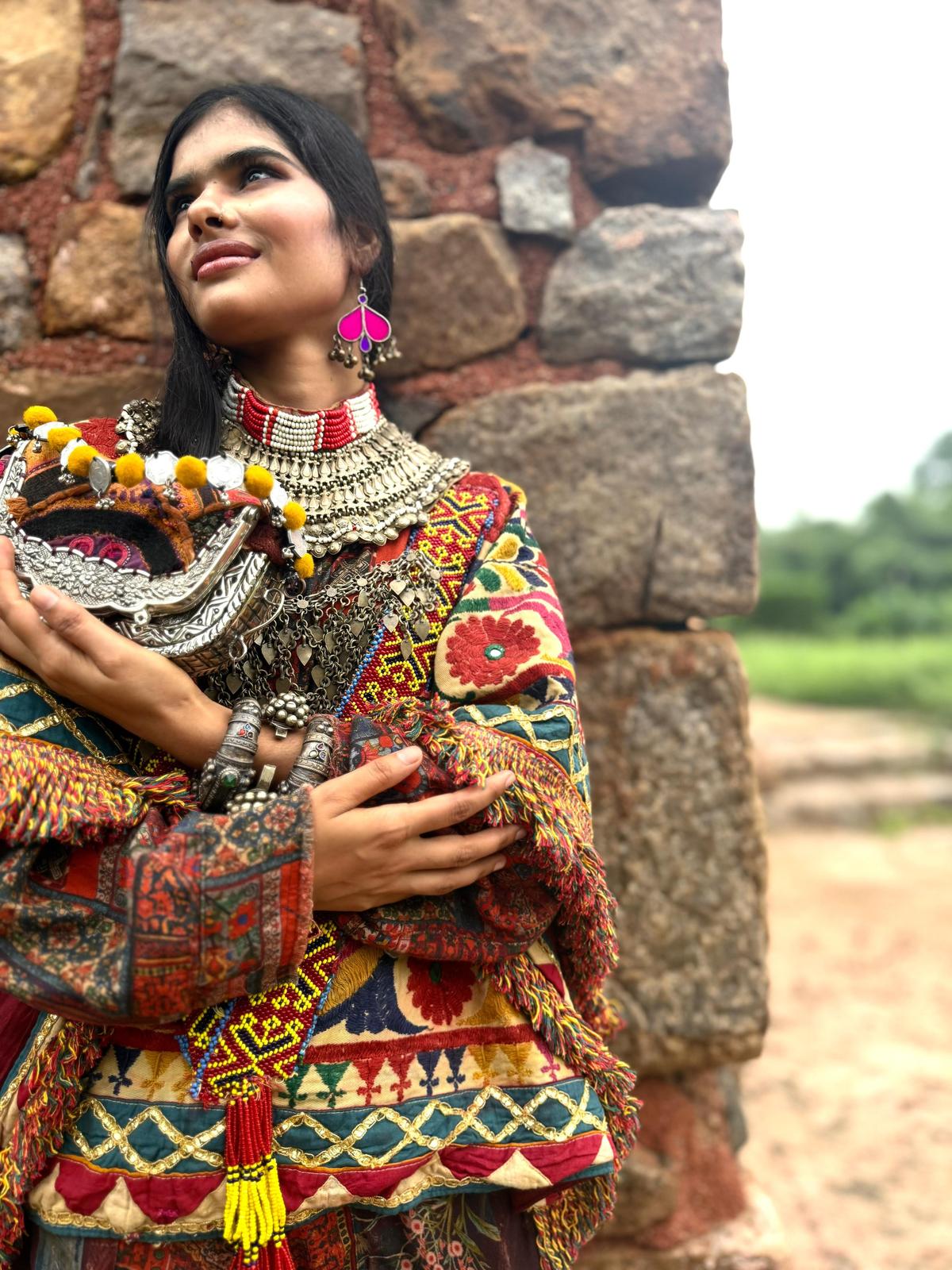 It’s twin, the Tarini, is a long ensemble crafted in organic, handwoven Kotpad cotton, dyed in shades reminiscent of fertile riverbeds. Traditional motifs reference tribal customs and rituals, with the goddess’ eyes offering a protective gaze over extra weft birds, peacocks, temples, and trees. The belt is strung with colourful lubu beads, traditionally worn by women of the Bonda community.