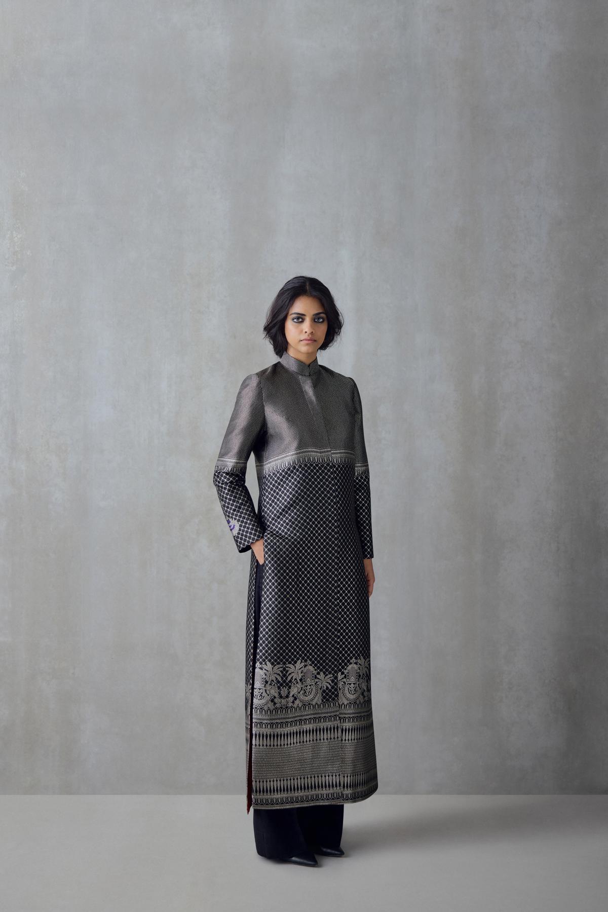 There is something distinct about women designing for women. Khandwala’s minimal chic designs have found admirers among discerning consumers and A-list actors such as Deepika Padukone, Alia Bhatt, and Tabu. Despite the widespread revival of Banarasi brocade over the last two decades, the designer’s work stands apart for its clarity and restraint. This handwoven, longline silk brocade jacket from her Autumn-Winter collection reinterprets the structure of a classic men’s sherwani into a precisely constructed feminine form.