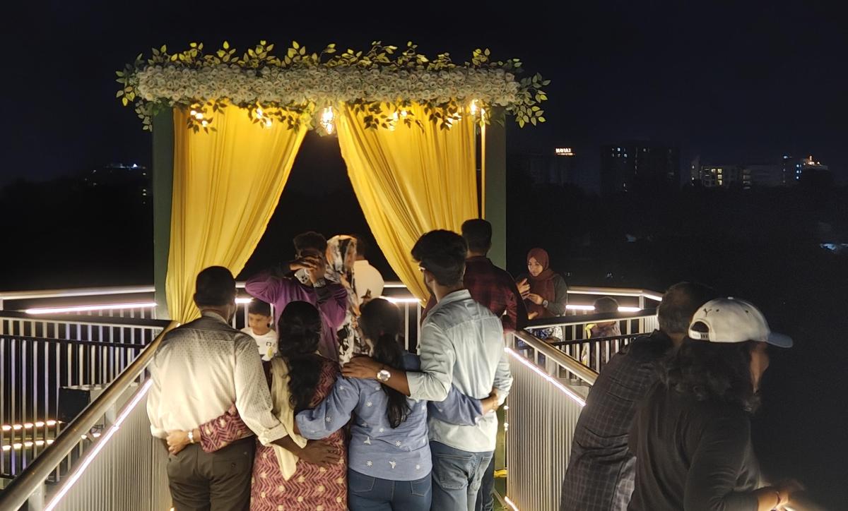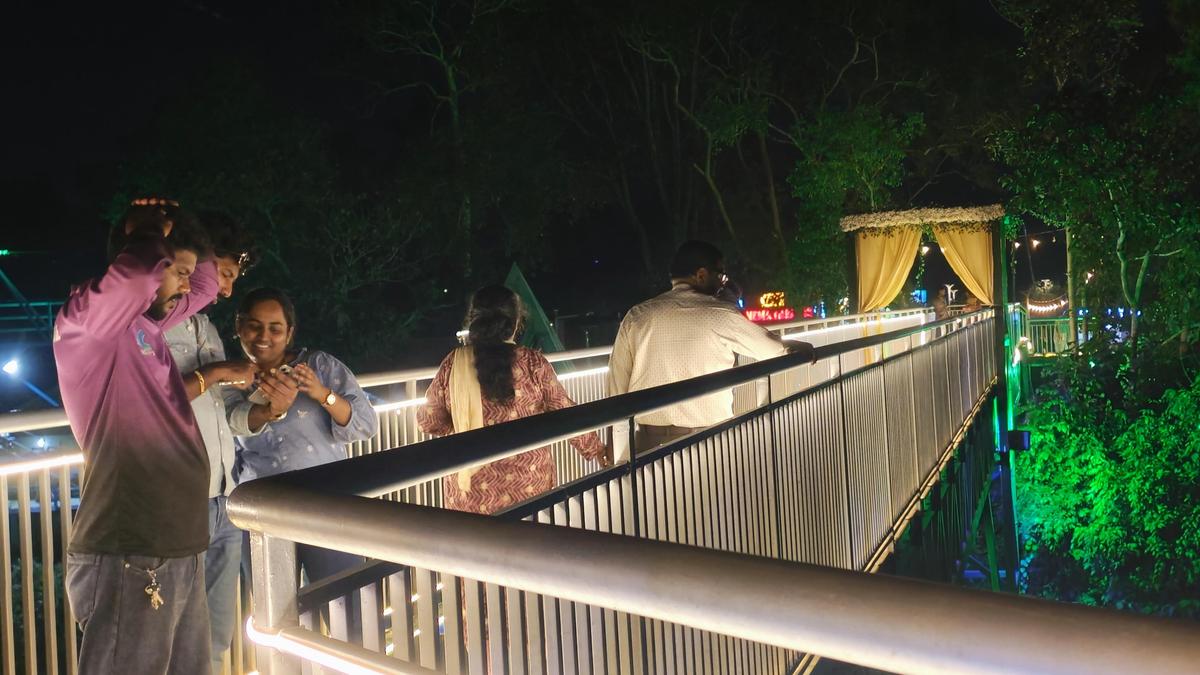 At the end of the structure, on one side, there is an Air Force museum shaped like an aircraft, and on the other side are trees. In the centre, a rectangular arch decorated with satin fabric and artificial flora can be found – the designated photo area for this experience. Families hog this space one by one, getting their picture taken by the staff, while a few make do with a selfie. The bridge is lit up in red, blue, green and purple – creating a picturesque setting for cinematic photographs.