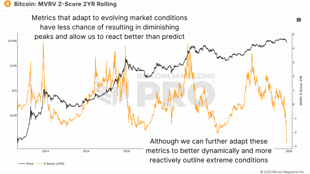 The MVRV Z-Score 2-Year Rolling metric has been a core tool for identifying overheated conditions, but in this cycle, it did not call the bull market peak particularly well. It registered a major spike as Bitcoin first pushed through the $73,000–$74,000 zone, yet failed to give a clean exit signal for the later stages of the advance. Currently, the metric is printing the most oversold readings on record.