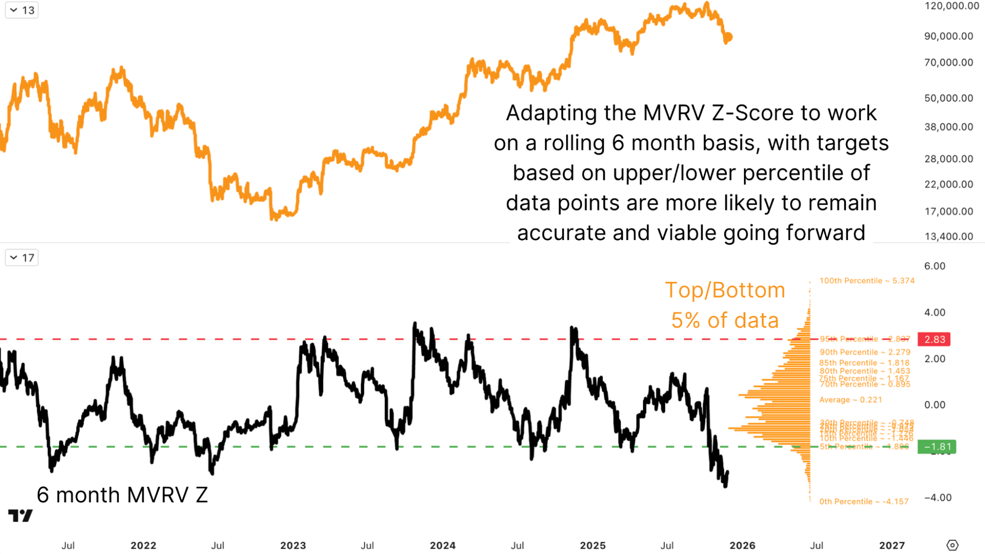 To address this shortcoming, the MVRV Z-Score can be recalibrated on a 6-month rolling basis rather than two years, making it more sensitive to recent conditions while still anchored in realized value dynamics. Alongside the shorter lookback, it is helpful to move away from fixed thresholds and instead use dynamic distribution-based bands. By mapping the percentage of days spent above or below different Z-Score levels, it becomes possible to mark zones such as the top 5%, as well as the bottom 5% on the downside. During this cycle, Bitcoin did register signals in the upper bands as it first broke above $100,000, and historically, moves into the top 5% region have coincided reasonably well with cycle peaks, even if they did not capture the exact tick high.
