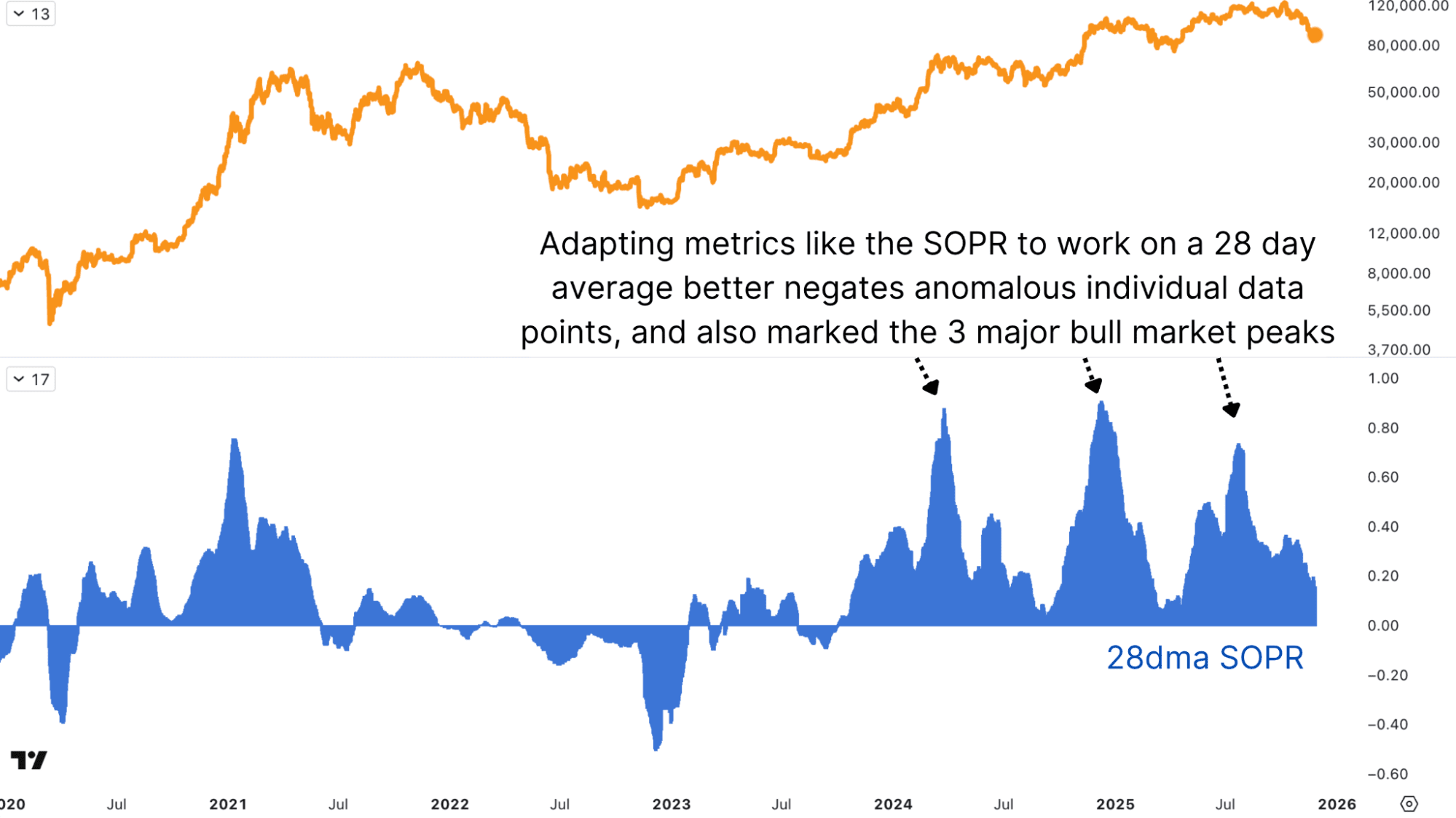 The Spent Output Profit Ratio (SOPR) provides another lens on realised profit-taking, but the raw series can be noisy, with sharp spikes, frequent mean reversion, and large moves both during rallies and during intra-bull capitulations. To extract more actionable information, a 28-day (monthly) change in SOPR can be used instead. This smoothed alternative highlights when the pace of profit realisation is accelerating to extreme levels over a short window, cutting through the noise of intra-cycle volatility.