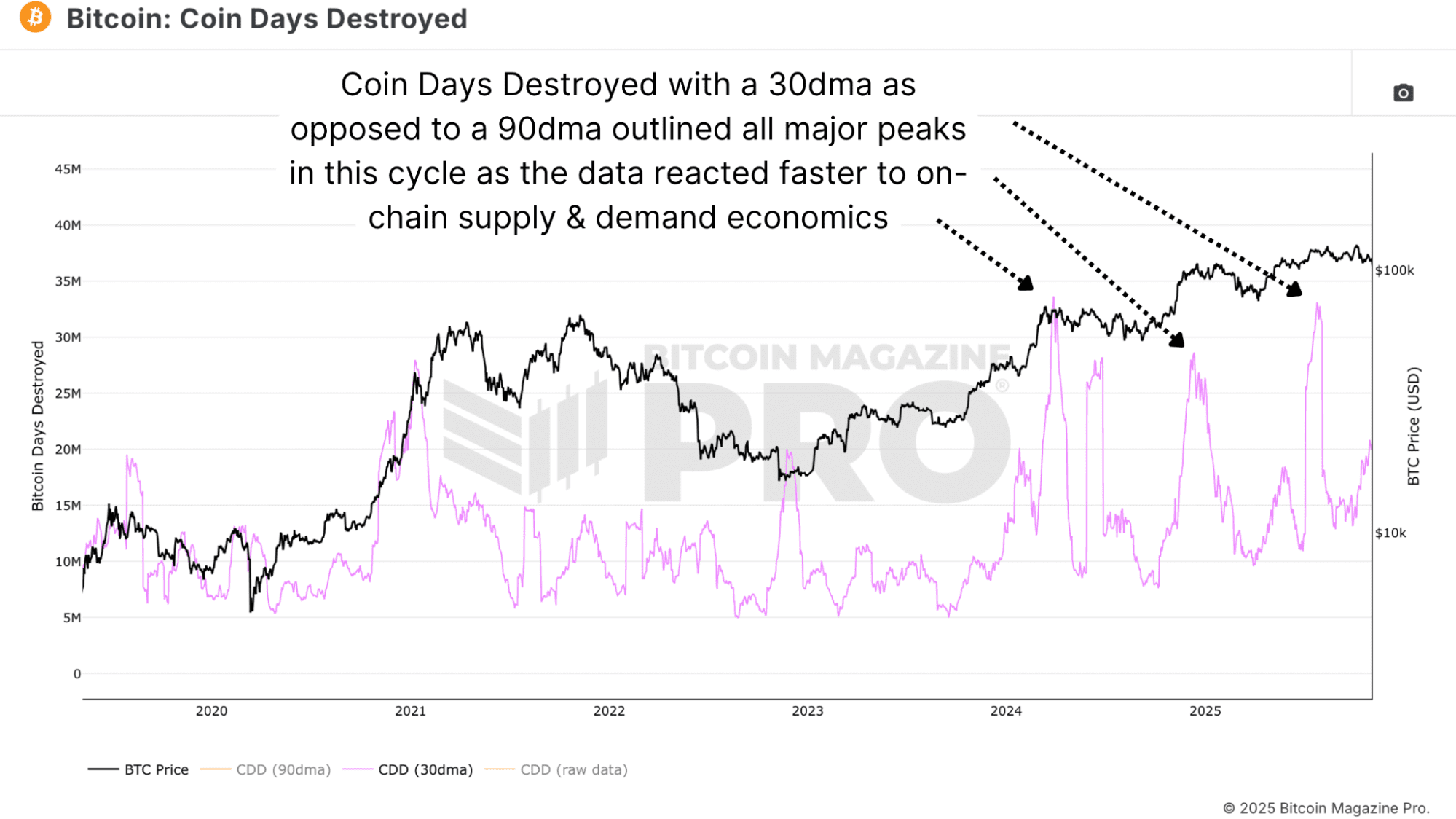 Beyond valuation tools, activity-based indicators like Coin Days Destroyed can be made more useful by shortening their lookback periods. A 90-day moving average of Coin Days Destroyed has historically tracked large waves of long-term holder distribution, but the more muted and choppy nature of the current cycle means that a 30-day moving average is often more informative. With Bitcoin no longer delivering the same parabolic moves, metrics need to react faster to reflect today’s shallower yet still important waves of profit-taking and investor rotation.