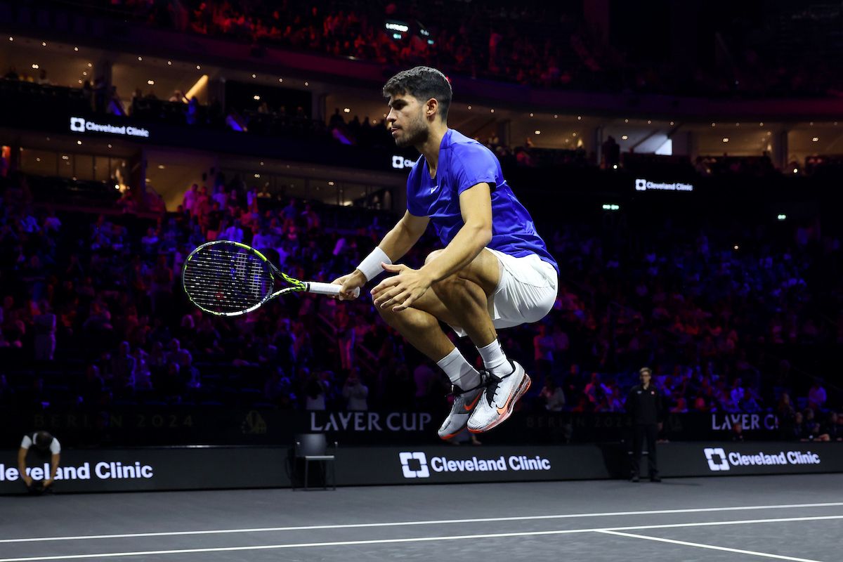 Carlos Alcaraz gets the crowd going at Uber Arena. Photo by Luciano Lima/Getty Images