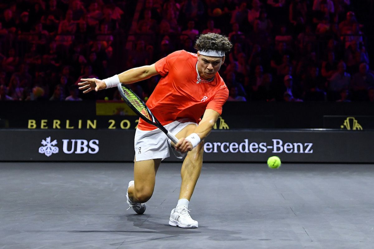 Ben Shelton bends low for a slice backhand. Photo by Luciano Lima/Getty Images
